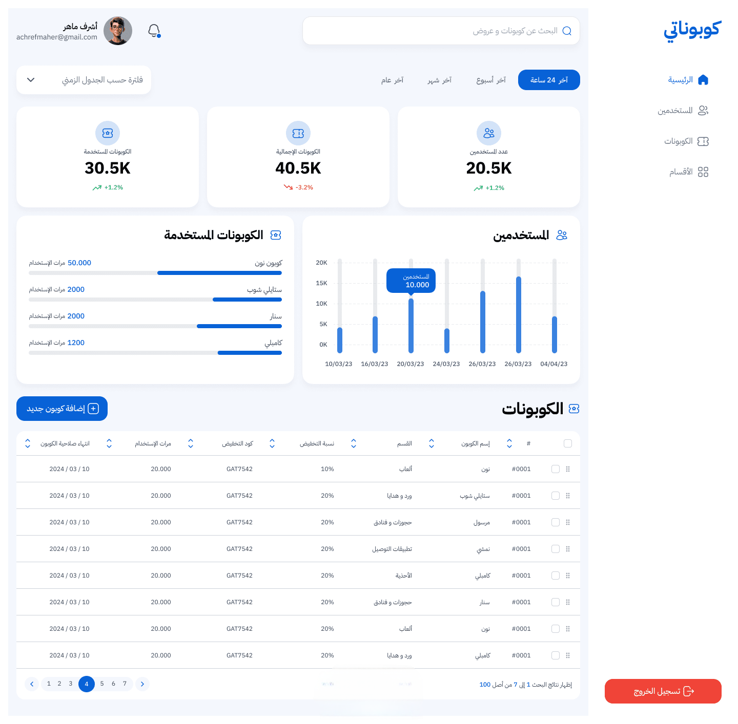 Coupnati is a comprehensive coupon and deal platform that allows users to discover and share discount codes. The platform features a web interface and mobile application, connected via a Laravel API with Sanctum authentication. Users can browse, search, and save favorite coupons, while administrators can manage content and track performance through detailed analytics.